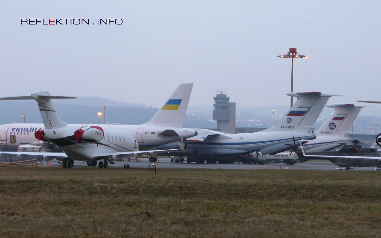 WEF - Wirtschaftsgipfel in DAVOS mit Ilyushin 76 Während des Weltwirtschaftsgipfels in Davos am letzten Januar-Wochenende waren auf dem Zürcher Flughafen Kloten mehr als 1130 zusätzliche Flugbewegungen zu verzeichnen. Eröffnet wurde das Forum vom russischen Präsidenten Medwedew, der mit nicht weniger als 3 Flugzeugen angereist war. In den beiden jetzt auf dem Flughafen Kloten parkenden Großraumtransportern vom Typ Ilyushin 76 (RA-788844 und RA-76638) wurden lediglich Fahrzeuge und Versorgungsgegenstände der russischen Delegation herbei geschafft. Der Blick auf die beiden Ilyushin wird leicht versperrt von einer Bombardier Challenger 300 (C-GRCY) der kanadischen Delegation und der ukrainischen Regierungsmaschine Airbus A320 (UE-ABA).