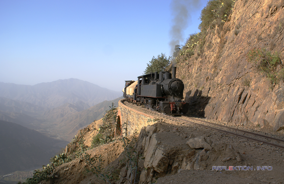 FERROVIE ERITREA Die Mallet-Dampflok der FERROVIE ERITREA (FE) ist mit ihrem Güterzug auf Bergfahrt nach der auf mehr als 2000 Meter Höhe gelegenen Landeshauptstadt Asmara. Als Eritrea noch italienische Kolonie war, ist von der Hafenstadt Massawa am Roten Meer nach Asmara eine Eisenbahn mit einer Spurweite von 950 mm gebaut worden. Nach Abzug der Italiener (im zweiten Weltkrieg waren die Briten in die italienische Kolonie eingedrungen und hatten das Land besetzt) war Eritrea von Äthiopien besetzt worden. Der Unabhängigskeitskrieg dauerte fast 40 Jahre, zerstörte das Land nahezu vollständig und endete 1993. Seitdem wird die über 100 km lange Strecke langsam wieder aufgebaut. Erstmals wurden im Jahr 2009 für touristische Zwecke Güter- und Personenzüge arrangiert und so fuhr nach der Staatsgründung Eritreas der erste Zug mit sieben Wagen auf der Strecke. Die „Fahrbahrmachung“ dieser Wagen war durch einen deutschen Eisenbahn-Reisen-Veranstalter (FarRail Tours) finanziert und in Auftrag gegeben worden - dringend benötigte Devisen für das geschundene Land! Mehr Eritrea: Bild des Tages vom 29. April 2009 und Bild des Tages vom 2. Juli 2009