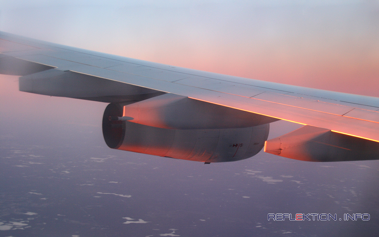 LUFTHANSA AIRBUS A340-300 D-AIGU CASTROP-RAUXEL Der Flug LH718 nach Fernost hat kurz vor Sonnenuntergang den Ural, die Grenze zwischen Europa und Asien überflogen. Mit kräftigen, feuerroten Strahlen trifft die Sonne genau von hinten die ostwärts fliegende Maschine an Triebwerken und Tragflächengondeln. Rund 11.500 Meter tiefer ist das Tageslicht aus dem westsibirischem Tiefland fast gewichen. In rund 5 Flugstunden wird es wieder hell werden. Dann strahlt die Sonne genau von vorn und die Maschine wird sich bereits über dem Gelben Meer befinden. An der mittleren Tragflächengondel ist sehr deutlich das große Ablaßventil zu erkennen, durch das der Treibstoff vor einer Notlandung schnell abgelassen werden kann.
