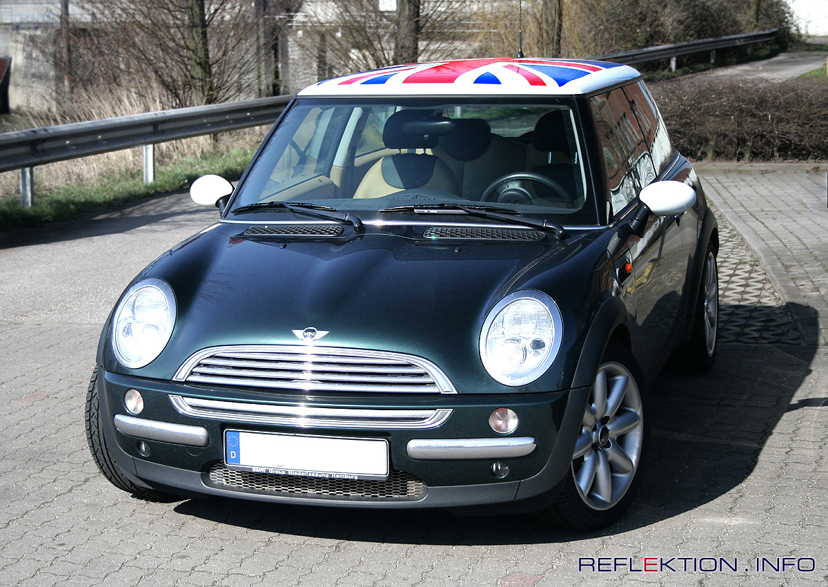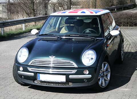 NEW MINI Mit einem sehr geschickten Design sowohl außen als auch innen ist es BMW gelungen, mit dem NEW MINI an den KLASSIK MINI anzuknüpfen und auch dem neuen Auto in überraschend kurzer Zeit Kultstatus zu verleihen. Auch der klassische MINI trug schon wie dieser NEW MINI COOPER den UNION JACK auf dem Dach. Technische Daten: Radstand 2467 mm, Länge 3699 mm, Breite 1683 mm, Höhe 1407 mm Leergewicht 1065 kg, Zuladung 395 kg Tankinhalt 40 Liter Motor: BMW/PSA Typ S-4 4 Zylinder, 16 Ventile, DOHC; 1598 ccm 120 PS, 88 KW bei 6000 U/min; 160 Nm bei 4250 U/min 0-100 km/h 9,1 Sek., Höchstgeschwindigkeit 203 km/h Durchschnittsverbauch 7,8 / 4,6 / 5,8 L/100 km; CO2 139 gr/Km