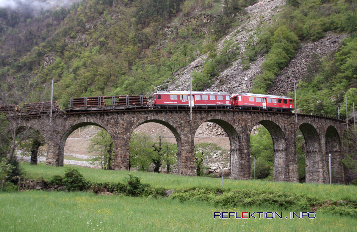 RHÄTISCHE BAHN - BERNINA BAHN KREISVIADUKT in BRUSIO Beim Abstieg bzw. Aufstieg nahe dem südlichen Ende der BERNINA BAHN im italienischen Tirano gelingt es der Bahn nur durch den Kreisviadukt von Brusio, die nötige Höhe von rund 25 Metern zu gewinnen bzw. zu verlieren. Der Kurvenradius schwankt zwischen 50 und 70 Metern. Mit den beiden Triebwagen ABe 4/4 47 und 48 und 4 angehängten Holztransportern ist der Regionalzug auf dem Weg von Tirano nach St. Moritz.
