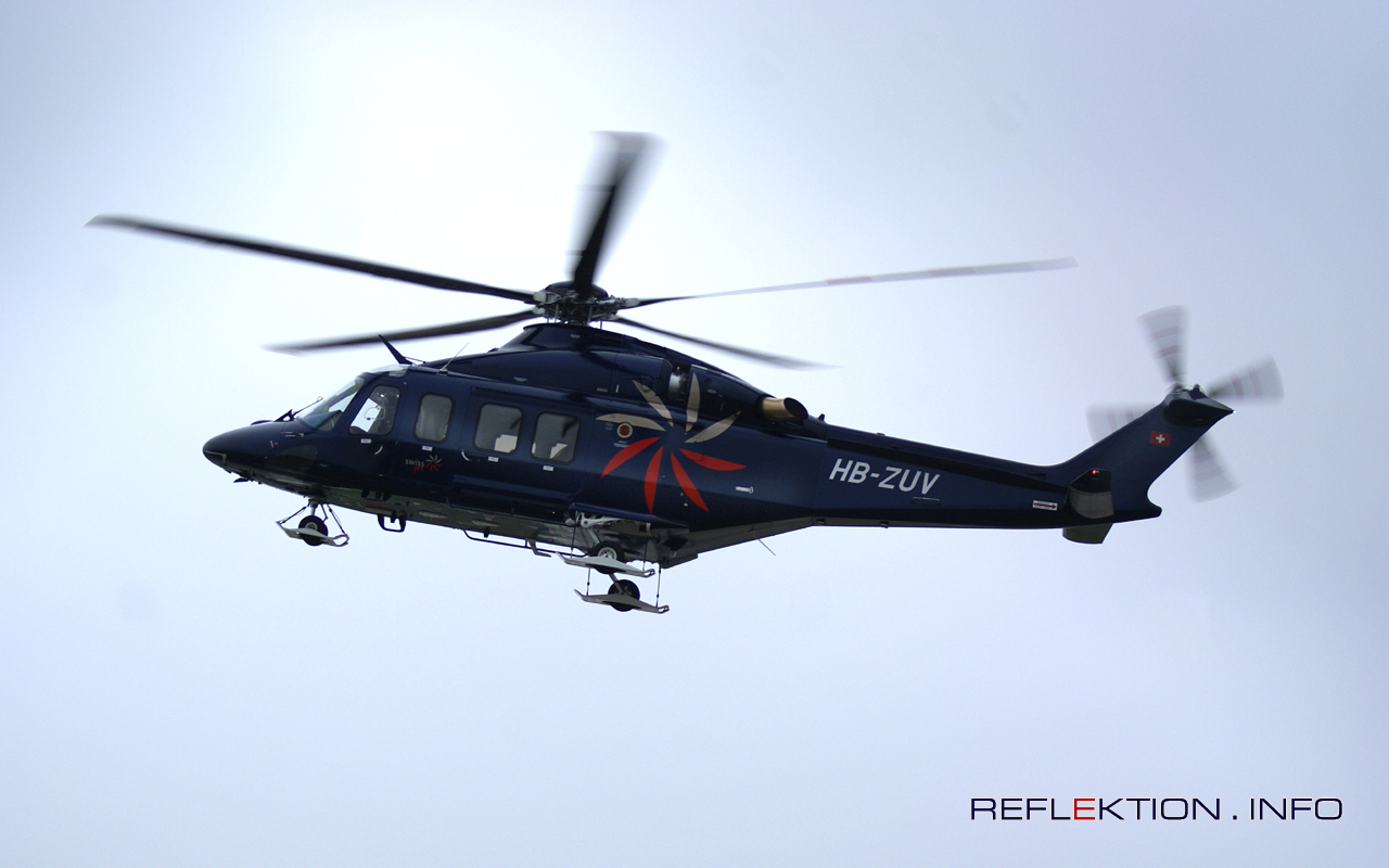 SWISS JET AG AGUSTA-WESTLAND AW 139 HB-ZUV Jedes Jahr zum Ende Januar findet im schweizerischen Davos das Weltwirtschaftsforum statt. Jeder, der etwas von Ökonomie versteht, und ebenso jeder, der meint etwas von Ökonomie zu verstehen, versucht, dorthin zu gelangen. Neben viel Sinnvollem wird selbstverständlich auch viel vorgetragen, bei dem allzu deutlich wird, daß der Vortragende eben selbst halt nicht allzu viel davon versteht, was er meint, vortragen zu müssen. Die deutsche Frau Bundeskanzler war selbstverständlich auch zugegen und pries einmal mehr Deutschland als Export- und Superland und zog wieder -niemand hatte anderes erwartet- viele gutgemeinte Ratschläge für andere Länder aus dem stets eleganten Blazer. Ob der letzte Satz jetzt im kausalen Zusammenhang zum vorigen Satz steht, möge jeder selbst einordnen. (Allerdings ‘gutgemeint’ ist das Gegenteil von ‘gut’) Da nun so viele Menschen nach Davos gelangen wollten, und bei weitem nicht allen nach eigenem Empfinden eine Bahnfahrt mit SBB und RhB zuzumuten ist, war nahezu die gesamte Schweizer Flugflotte für Charterflüge von Kloten nach Davos im Einsatz. So auch -wie schon im Vorjahr- die AGUSTA-WESTLAND AW 139 HB-ZUV der SWISS JET AG aus Lauterbrunnen BE. Mit 15 Sitzplätzen und 2 Piloten zählt die AW 139 schon zu den größeren Helis.