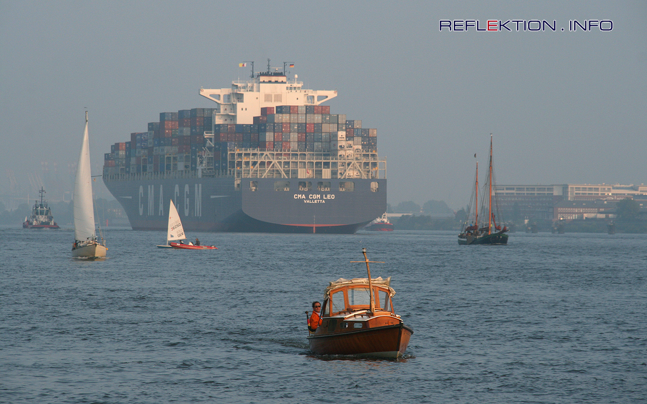 CMA CGM LEO An einem spätsommerlichen Freitag Nachmittag gingen 2010 zum letzten Mal in jenem Jahr viele Freizeitboote auf große Wochenendtour die Elbe hinab in Richtung Nordsee. Dabei muß immer mit etwas Gegenverkehr gerechnet werden, zum Beispiel in Form eines Containerfrachters wie der CMA CGM LEO, die mit einer Länge von 366 Metern, 52 Metern Breite und mit bis zu 11.400 Containern beladen doch schon zu den etwas größeren Schiffen gehört. So breitet sich Hoffnung aus, daß es auch 2011 wieder viele derartig schöne Tage geben wird. Ein Anfang ist gemacht.