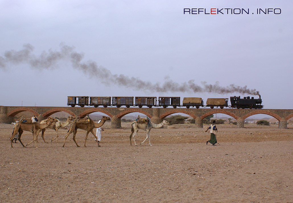 FERROVIE ERITREA Die Mallet-Dampflok 442.55 der FERROVIE ERITREA (FE) befährt bei Dogali den Viadukt Moncullo mit 14 gemauerten Bogen. Als Eritrea noch italienische Kolonie war, ist von der Hafenstadt Massawa am Roten Meer zur heutigen Hauptstadt Eritreas, Asmara, eine Eisenbahn mit einer Spurweite von 950 mm gebaut worden. Nach Abzug der Italiener ( im zweiten Weltkreig waren auch noch die Briten hier) war Eritrea von Äthiopien besetzt. Der Unabhängigskeitskrieg dauerte über 30 Jahre, zerstörte das Land nahezu vollständig und endete 1993. Seitdem wird die über 100 km lange Strecke langsam wieder aufgebaut. Erstmals in diesem Jahr wurden für touristische Zwecke Güter- und Personenzüge arrangiert und so fuhr nach der Staatsgründung Eritreas der erste Zug mit sieben zweiachsigen Güterwagen auf der Strecke. Die „Fahrbahrmachung“ dieser Güterwagen war durch einen deutschen Eisenbahn-Reisen-Veranstalter (FarRail Tours) finanziert und in Auftrag gegeben worden. Üblicherweise sind diese Wagen nicht mehr in Betrieb und auf verschiedenen Bahnhöfen unterwegs abgestellt. Die Heissdampf-Mallet-Maschine war 1938 durch die italienische Maschinenfabrik Ansaldo zusammen mit sieben Schwestermaschinen an die Eisenbahnen in Eritrea geliefert worden. Auf der folgenden Steigung von 3,5 % kann die Lok 90 Tonnen befördern. Sie stellt somit die stärkste Dampflokbaureihe dieser Bahn dar. Mehr Eritrea: Bild des Tages vom 29. April 2009
