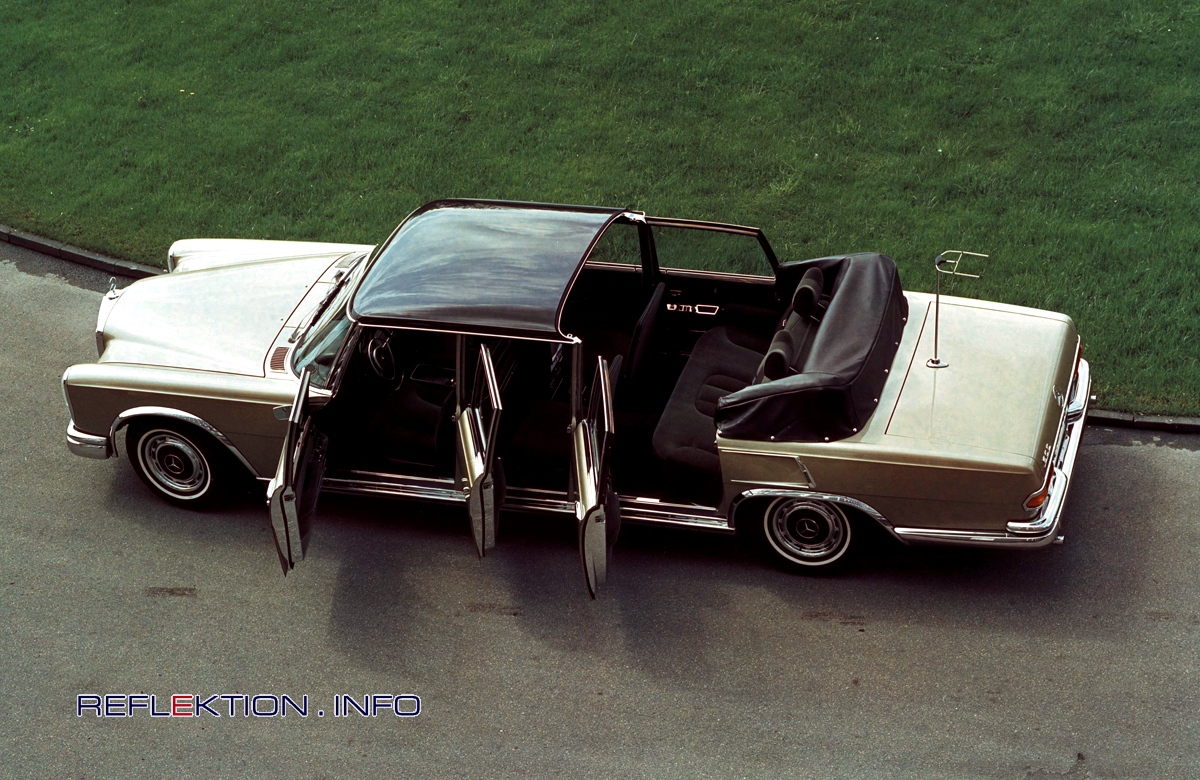 MERCEDES-BENZ 600 Die Entwicklung des Groß-, Reise- und Repräsentationswagens MERCEDES-BENZ 600 mit der Werk-Nr. W 100 begann Ende der Fünziger Jahre. Das Ziel war ganz einfach: immer der Stand des technisch Machbaren. Die mit einem 6,3 Liter großem und 250 PS starken V8-Motor ausgerüstete viertürige Limousine ist gut zwei Meter breit und 5,54 Meter lang, die Pullman-Limousine und die sechstürigen Versionen sind 6,24 m lang. Von insgesamt 2677 MB 600 wurden 49 Pullman-Limousinen als Landaulets gebaut; bei einem Landaulet ist ein Teil des Daches als Faltverdeck ausgeführt. Von 1964 bis 1981 wurde der in Serienausführung bis zu 2,7 Tonnen schwere und bis zu 205 km/h schnelle 600 gebaut.