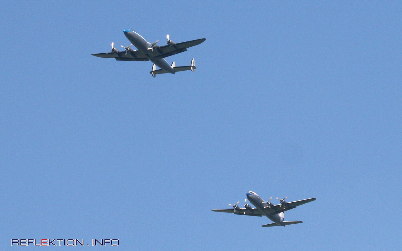 Die elegante und immer wieder beeeindruckende SUPER CONSTELLATION L-1049F  HB-RSC und die viermotorige DC-6A FLYING DUTCHMEN G-APSA starten zusammen mit 13 weiteren historischen Flugzeugen zum Formationsrundflug über Hamburg.