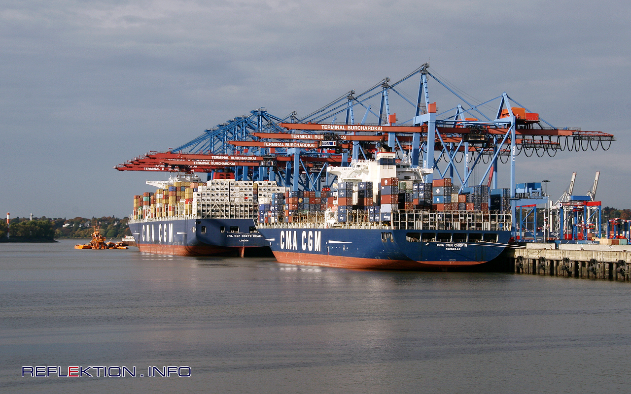 Containerfrachter CMA CGM CHOPIN & CMA CGM CORTE REAL Am Kai des Containerterminals BURCHARDKAI im Waltershofer Hafen -einem Teil des Hamburger Hafens- haben 2 Schiffe der französischen Reederei CMA CGM für rund 24 Stunden festgemacht und belegen rund 700 Meter Kailänge. Die kleinere CHOPIN ist 2004 gebaut worden und trägt bis 5782 20-Fuß-Container. Das Schiff mißt in der Länge 277 Meter, in der Breite 40 Meter. Der Tiefgang bei voller Beladung mit 73.235 Tonnen beträgt 14,50 Meter. Der 10 Zylinder-MAN-Motor leistet 57.819 kW oder 78.634 PS bei 104 Umdrehungen pro Minute und wirkt direkt auf den Festpropeller. Die maximale Geschwindigeit beträgt 24,5 Knoten bzw. 45 km/h. Im Linienservice EPIC kommt die Chopin (oder ein Schwesterschiff) alle 56 Tage nach Hamburg über Antwerp - Dunkirk - Le Havre - Port Said - Khor Fakkan - Jebel Ali - Port Muhammad Bin Qasim - Nhava Sheva - Mundra - Jeddah - Marsaxlokk - Tanger - Southampton - Rotterdam - Hamburg.
