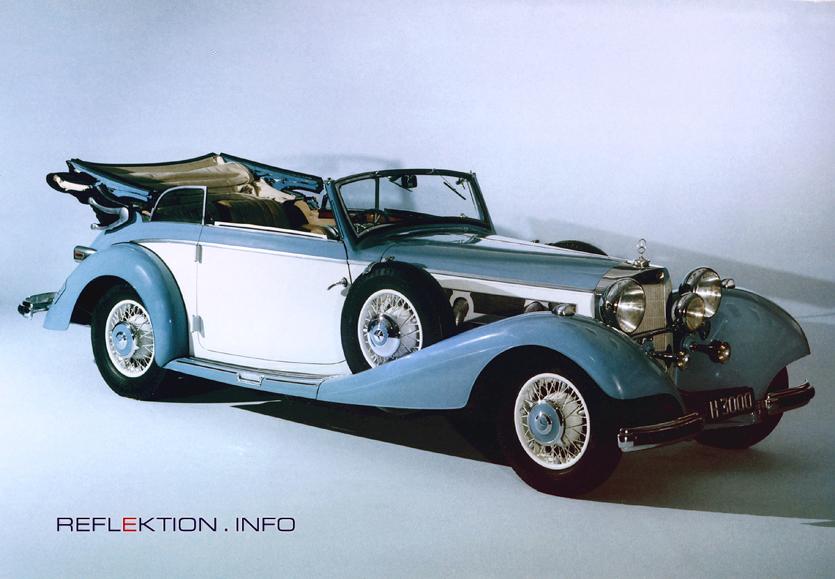 MERCEDES-BENZ 540 K CABRIOLET B Als Nachfolger des erfolgreichen 500 K erschien 1936 der noch elegantere 540 K CABRIOLET B (W29). Die technische Ausrüstung blieb gegenüber dem Vorgänger unverändert. Allerdings ist der Hubraum des neuen 8-Zylinder-Reihenmotors um knapp einen halben Liter auf 5401 ccm gestiegen. Im Saugbetrieb leistet der Motor 115 PS, der zuschaltbare Roots-Kompressor mobilisiert zusätzliche 65 PS. Nur bei 180 PS ist die Höchstgeschwindigkeit von 170 km/h zu erreichen. Von 1936 bis 1939 baute DAIMLER-BENZ 296 Cabriolet B. Das Cabriolet B hat den langen Radstand von 3290 mm der Limousine, Cabriolet A und C 'nur' 2980 mm.