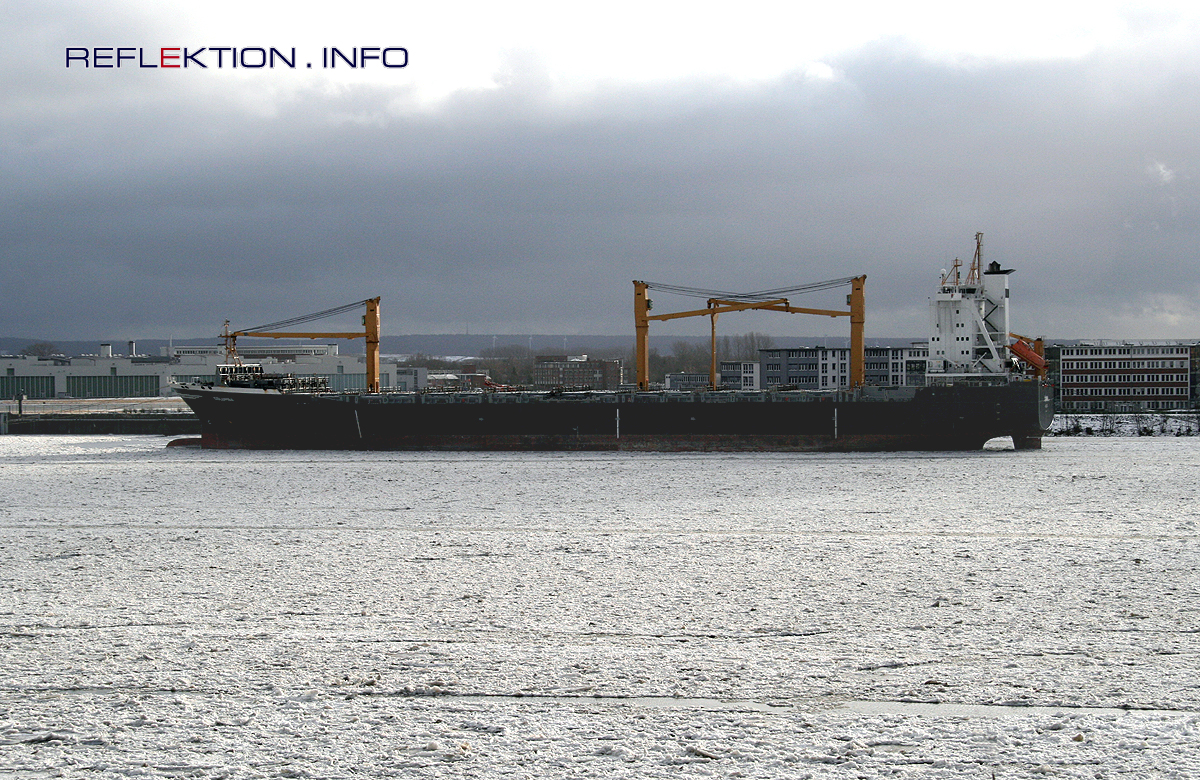 Containerfrachter COLUMBA So bedrohlich wie die heranziehende Schlechtwetterfront ist derzeit auch die Lage in der Containerschiffahrt. Weltweit sind mehrere Hundert Containerschiffe arbeitslos. Auch die 188 Meter lange und 30 Meter breite COLUMBA liegt beschäftigungslos im Hamburger Hafen vor Finkenwerder vor Anker. Mit den drei bordeigenen Ladegeschirren kann die COLUMBA Container auch in Häfen laden und löschen, die keine Containerbrücken besitzen. Die COLUMBA wartet genau vor dem AIRBUS-Werk Finkenwerder, links des Bugs beginnt die Start- und Landebahn des Werksflughafens.