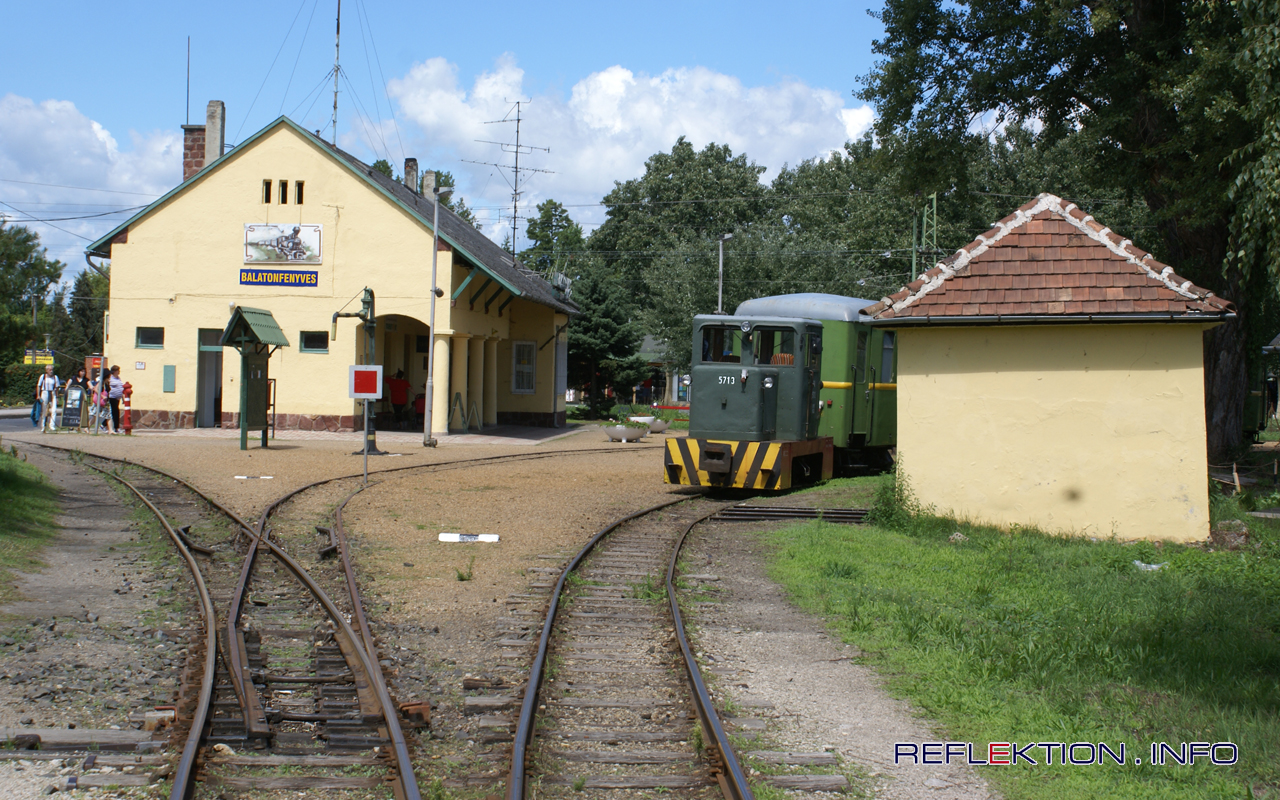 Wirtschaftsbahn in Balatonfenyves Das Netz der Wirtschaftsbahnen um Balatonfenyves am ungarischen Plattensee entstand in den Fünfziger Jahren in 760 mm Spurweite und diente zur Erschließung der trockengelegten Sumpfgebiete am Südufer des Plattensee (Balaton). Ab 1956 wurde auch Personenverkehr auf der als Güterbahn konzipierten Bahn betrieben. Ursprünglich sollte ein Schienennetz von rund 100 Kilometern entstehen. Ab 1957 wurde aber bei einer Gleislänge von 62 Kilometern der Bau eingestellt. Mitte der Siebziger Jahre ging das Güteraufkommen stetig zurück. 1990 wurde der Güterverkehr eingestellt. Im Gegensatz dazu wurde die Bahn nun mehr touristisch genutzt. Heute verkehren die Personenzüge auf 14 km Länge zwischen Balatonfenyves und Somogyszentpal. Mehrere zweiachsige Dieselloks der Reihe C50 wie die 5713 stehen zur Verfügung. Die Züge benötigen vom Bahnhof in Balatonfenyves GV über Központi Főmajor bis zur Endhaltestelle rund 40 Minuten.