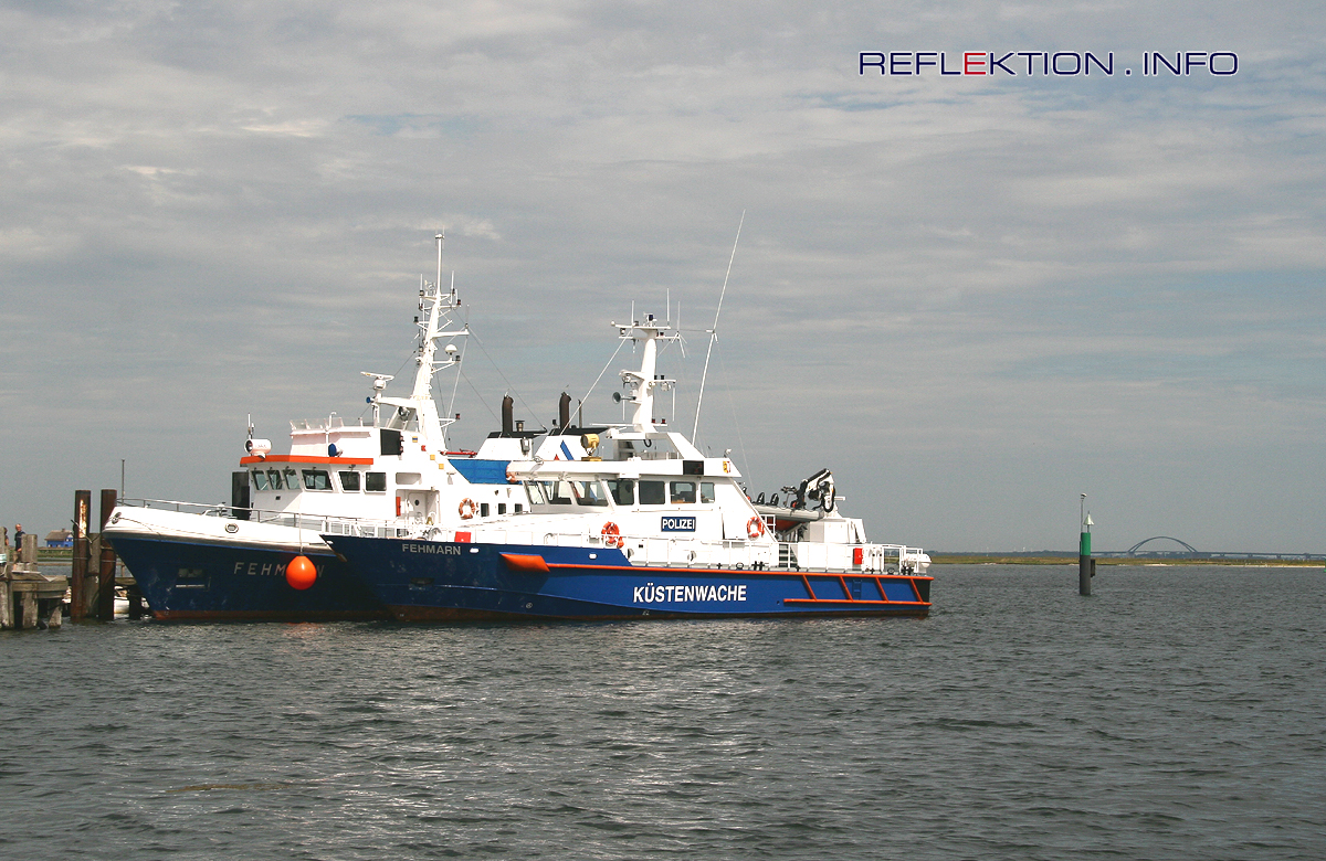 KÜSTENWACHE - 2 Boote, 1 Name Die Erklärung ist schnell gefunden. Die hintere FEHMARN, das Küstenstreifenboot von 1988, ist außer Dienst gestellt und bereits für 380.000 Euro versteigert worden. Davor liegt das neue, 4,5 Millionen teure Küstenstreifenboot FEHMARN, das seit dem 28. Mai 2010 die Aufgaben des Vorgängerbootes übernommen hat. Beide Boote liegen am 8. Juli vertäut im Hafen von Heiligenhafen. Im Hintergrund ist die Fehmarnsundbrücke zu sehen.
