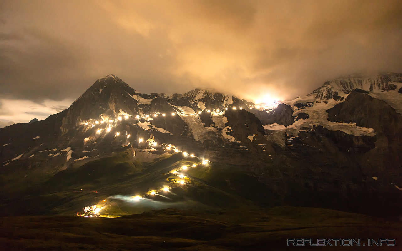 Vor hundert Jahren sprengten italienische Bauarbeiter den letzten Felsbrocken mit einer gewaltigen Ladung Dynamit und schafften den Durchschlag auf das Jungfraujoch. Am 1. August 1912 wurde die höchstgelegene Bahnstation Europas eröffnet. Genau hundert Jahre später feierte die Jungfraubahn ihr Jubiläum mit einem Feuerwerk. In den Nordwänden der Berge Eiger und Mönch leuchteten 48 Fackeln fünf Minuten lang auf und illuminierten die ganze Strecke der Jungfraubahn von Kleine Scheidegg bis Jungfraujoch. Die Besucher der Jubiläumsfeierlichkeiten verfolgten das Spektakel unterhalb der Eigernordwand.