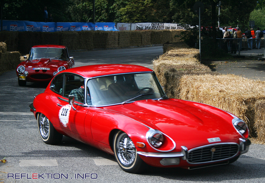 JAGUAR E Type 2+2 FHC (Fixed Head Coupé) in voller Aktion beim 7. Hamburger Stadtpark Revival. Einige Daten: Baujahr ab 1970 (2+2 FHC) Länge 4674 mm, Breite 1683 mm, Höhe 1270 mm, Radstand 2667 mm Leergewicht 1499 kg, Tankinhalt 80 Liter V12, 5344 ccm, DOHC, 12 x 2 Ventile, Kompression 11:1 275 PS bei 5850 U/min, 412 Nm bei 3600 U/min 0-100 km/h 6,8 s Höchstgeschwindigkeit rund 230 km/h