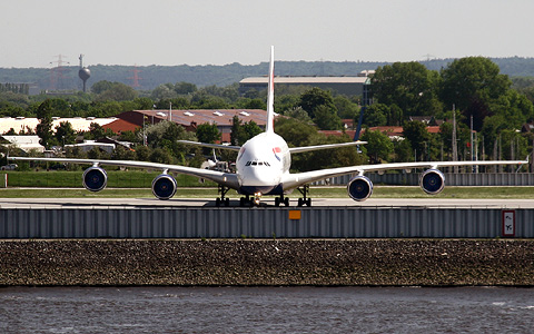 Die Start- und Landebahn endet direkt am südlichen Elbufer, so daß die A380 aus einer Entfernung von rund 1100 Meter vom anderen Elbufer aus gut beobachtet werden kann.