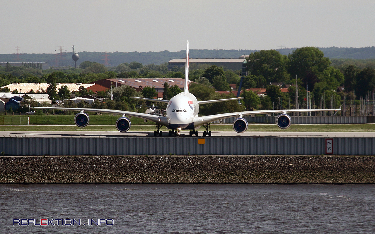 7 A380 hat BRITISH AIRWAYS bestellt. Die zweite Maschine ist fertig montiert und lackiert und hier zu Testfahrten auf dem AIRBUS-Gelände in Hamburg-Finkenwerder unterwegs.