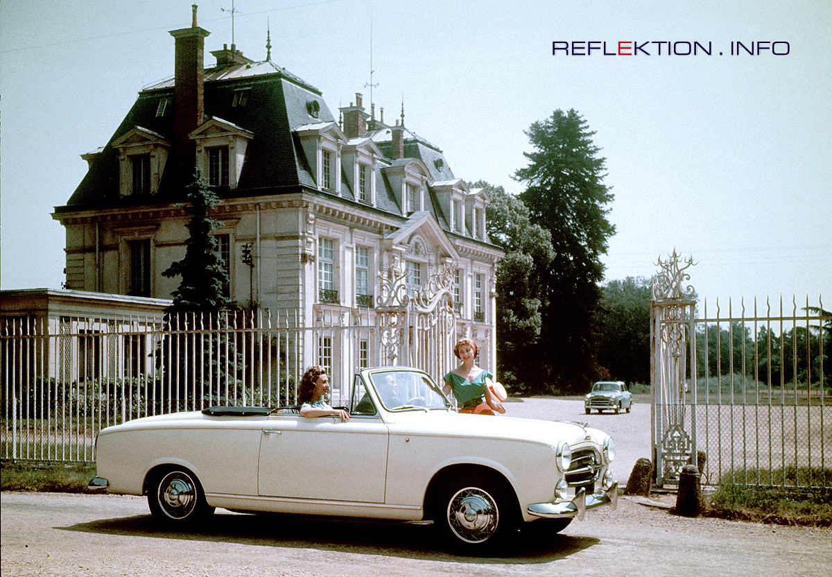 PEUGEOT 403 CABRIO In nur kleiner Stückzahl baute PEUGEOT auf Basis der 403-Limousine ein Cabrio, das die Eleganz jener Zeit ausdrückt. Zu Unrecht fand das Cabrio nicht allzu viel Verbreitung - aber mindestens ein Exemplar ist in die USA exportiert worden und als Dienstwagen von Inspector Columbo zu Filmruhm gekommen. Im Hintergrund vor dem Portal des prächtigen, typisch französischen Landhauses parkt die 403-Limousine. Technische Daten: Länge 4470 mm, Breite 1676 mm, Höhe 1570 mm, Radstand 2667 mm, Leergewicht 1080 kg 4-Zylinder-Reihenmotor, 8 Ventile, 1468 ccm, 65 PS bei 4900 U/min, 102 Nm bei 2500 U/min Höchstgeschwindigkeit rund 138 km/h