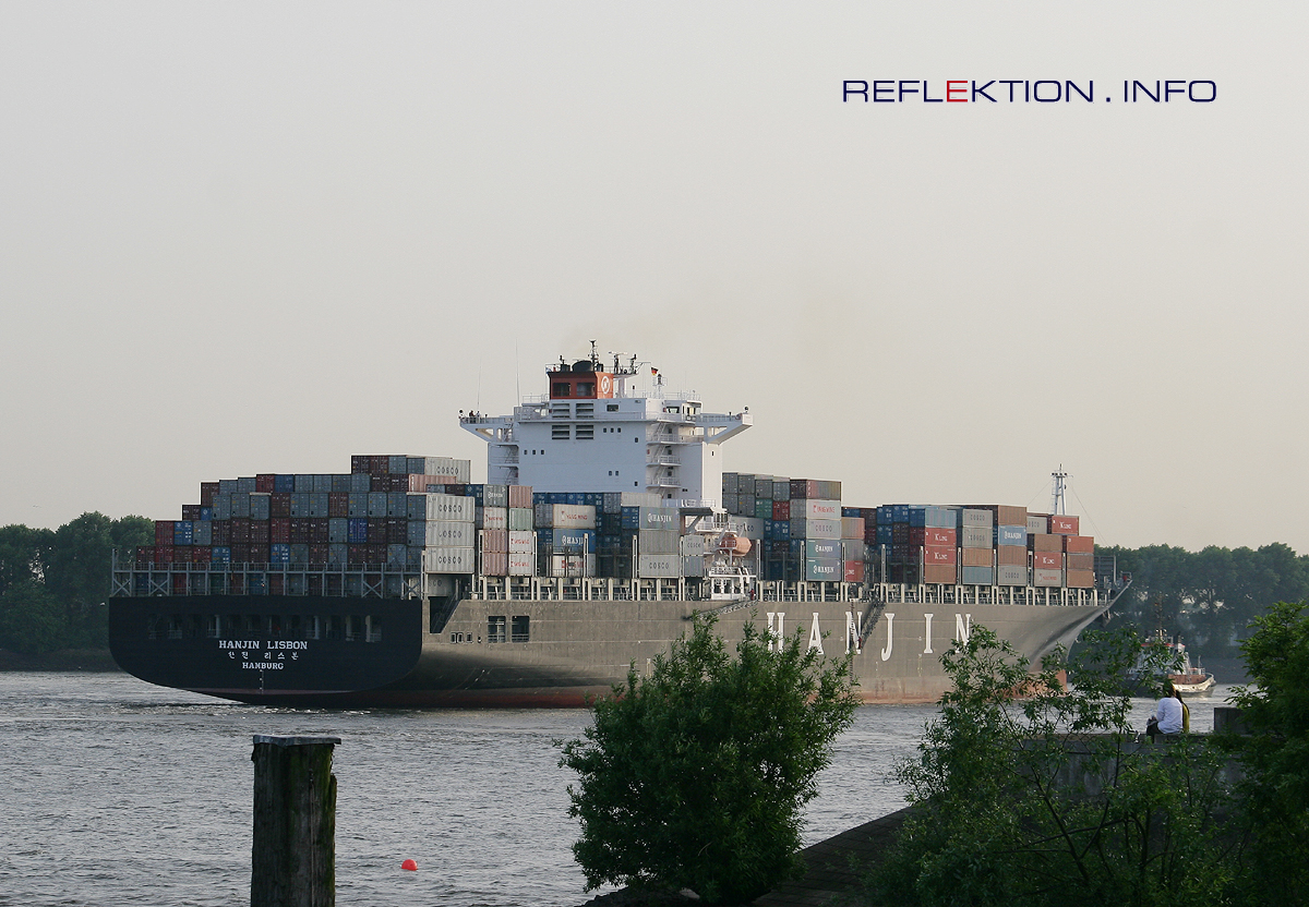 Containerfrachter HANJIN LISBON Die HANJIN LISBON verläßt den Hamburger Hafen, hier auf Höhe des Museumshafen Övelgönne, mit Ziel Shanghai. Auf diesem Schiff steht eine Anzahl an Kabinen für Touristen zur Verfügung. Für die Doppelkabine (30 qm inklusive Bad mit 1 Schlaf- und 1 Wohnraum, 1 Doppelbett 2,05 x 1,80 m, DU/WC, Kleiderschrank, Kühlschrank, TV, 2 Sofas, Tisch, Schreibtisch, Sideboard, 3 Stühle, Teppichboden, Ausblick vorne) werden pro Tag und Person nur 90 Euro berechnet - bei Alleinbenutzung 105 Euro. Drei Mahlzeiten pro Tag in der Offiziersmesse sind im Preis enthalten - nur Getränke müssen extra bezahlt werden. Nähere Informationen erteilt das Reisebüro der Reederei: NSB Reisebüro GmbH / Frachtschiff-Touristik in 28195 Bremen