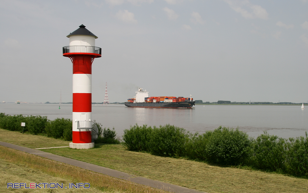 Leuchtfeuer in Lühe/Unterelbe Direkt am Elbufer ist dieser Leuchtturm 2010 erbaut worden und ersetzt den über 100 Jahre alten direkt hinter dem Elbdeich gelegenen Leuchtturm Mielstack. Mit modernster Technik weist der neue Leuchtturm den elbauf- und elbabwärts fahrenden Schiffen den Weg. Im Hintergrund fährt der 269 x 33 Meter messende und bis zu 4173 20-Fuß-Container tragende Frachter VALPARAISO EXPRESS der HAPAG nach Hamburg.
