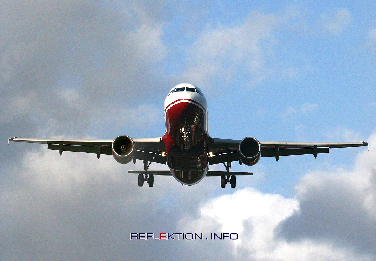 AIR BERLIN AIRBUS A319-112 D-ABGE Planmäßig um 18.15 Uhr schwebt die A319 aus Malaga kommend zur Landung in Hamburg-Fuhlsbüttel ein. Seit dem 18. Juni 2007 steht die Maschine mit der Fabrik Nr. 3139 in Diensten von AIR BERLIN. A319 - Allgemeine Daten: Länge 33,83 m, Rumpfbreite 3,69 m, Spannweite 34,10 m, Höhe 12,00 m. Reisegschwindigkeit 840 km/h, Reichweite max. 5.500 km, max. Flughöhe 11.900 m, Bestuhlung 110 - 142