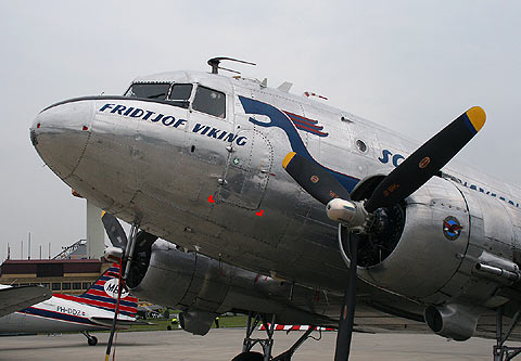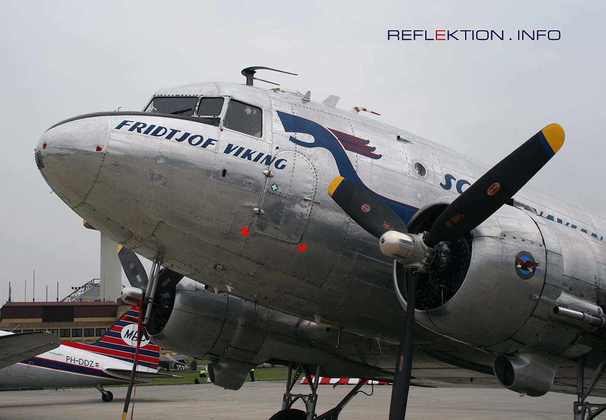 DOUGLAS DC-3 FRIDTJOF VIKING Der FLYGANDE VETERANER der SAS war eine von 9 DOUGLAS DC-3, die die Hamburger Airport Days am 15. und 16.9.2007 besuchten. Länge: 19,65 m, Spannweite 29,26 m, Höhe 5,16 m Reisegeschwindigkeit 280 km/h, Reichweite 1300 km 2 14-Zylinder-Sternmotoren Pratt & Whtiney Twin Wasp R1830, je 1200 PS Baujahr 1943, 1948 - 1957 bei der SAS im Liniendienst, seit 1985 SAS-Veteran, Heimtflughafen Stockholm-Bromma mehr zu den AIRPORT DAYS... mehr zum Formationsflug bei den AIRPORT DAYS...