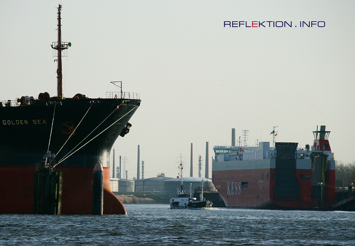 KÖHLBRAND Genau unterhalb eines der Hamburger Wahrzeichen, der Köhlbrandbrücke, liegen links, am Kai an der Ölmühle der 240 Meter lange Tanker GOLDEN SEA und gegenüber der 150 Meter lange Autotransporter ELBE HIGHWAY der Reederei KESS