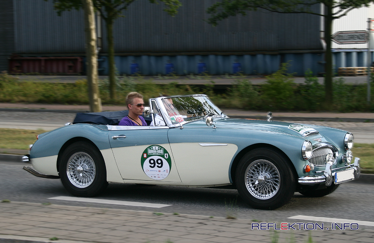 AUSTIN HEALEY 3000 Mk III Recht zügig startet der AUSTIN HEALEY nach Passieren des Kontrollpunktes am Hamburger Freihafen durch. Die Nr. 99 der 2. Klassikerfahrt Hamburg-Berlin sollte wohl rechtzeitig zur Tagesschau am Ziel sein. Der Fahrer wird’s wissen... Der 6-Zylinder mit 2912 ccm von 1966 leistet 150 PS, die Höchstgeschwindigkeit ist bei 198 km/h erreicht, das höchste Drehmoment mit 224 Nm bei 3500 U/min.