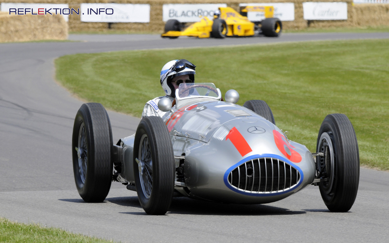 JOHN SURTEES im MERCEDES-BENZ W 165 Bei der letztjährigen Veranstaltung des Festival of Speed im südenglischen Goodwood, die vom 1. bis zum 3. Juli 2011 unter dem Motto „Racing Revolutions – Quantum leaps that shaped motor sport“ stattfand, nahm die Daimler-Benz-Classic-Sparte mit bedeutenden Motorsportfahrzeugen auf der 1,86 Kilometer langen Bergrennstrecke teil. In Goodwood waren legendäre Rennwagen wie der eigens für den Großen Preis von Tripolis des Jahres 1939 entworfene Silberpfeil W 165 am Start. Der W 165 entsprach dem Reglement der sogenannten Voiturette-Klasse, die einen maximalen Hubraum 1500 ccm erlaubte. Eine Treibstoffspezialmischung aus großenteils Methylalkohol, Azeton, Schwefeläther und etwas Benzin erwirkten eine Literleistung von deutlich mehr als 170 PS. So leistete der V8-Motor aus 1492 ccm mehr als 260 PS. Das zeigte den Mitbewerbern ALFA ROMEO und MASERATI, für deren Vorteil diese Hubraumklasse eigentlich eingeführt worden war, deutlich ihre Grenzen auf. Am 7. Mai 1939 erzielte Mercedes-Benz beim 13. Großen Preis von Tripolis mit dem neuen W 165 einen Doppelsieg. Hermann Lang gewann das knapp zweistündige Rennen (394 km), zu dem rund 30 Wagen gestartet waren, mit einem Durchschnitt von 197,79 km/h vor seinem Teamkollegen Rudolf Caracciola, später gefolgt von Emilio Villoresi (Alfa Romeo) und Piero Taruffi (Maserati). Einen weiteren Start hat es wegen der heraufziehenden Weltkatastrophe nicht mehr gegeben. In Goodwood wurde der W 165 von Sir John Surtees pilotiert, der im Jahr 1934 geborenen Rennfahrerlegende.