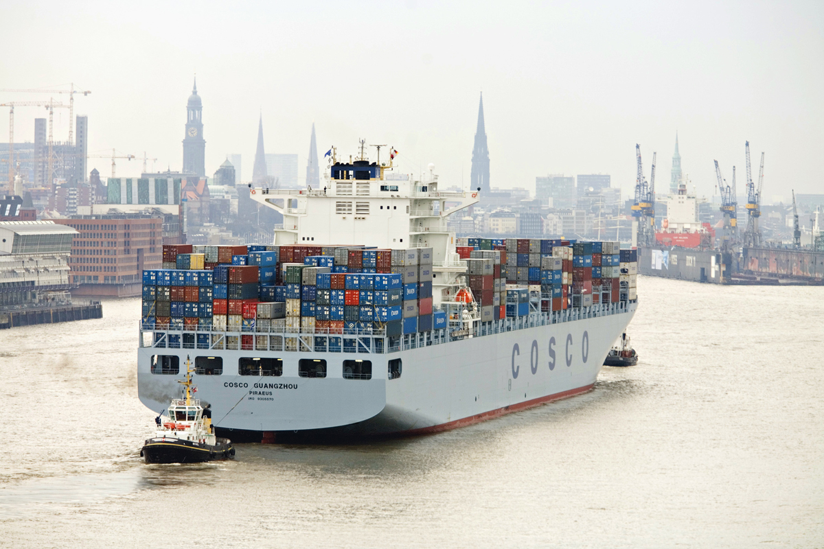 COSCO GUANGZHOU Der Containerfrachter ist derzeit eines der größten Schiffe der Welt. Der Schachteldampfer der Reederei COSCO läuft während seiner Jungfernfahrt in den Hamburger Hafen ein. Die unter griechischer Flagge fahrende COSCO GUANGZHOU ist 42,8 Meter breit, 350 Meter lang und hat einen maximalen Tiefgang von 14,5 Meter. Sie kann rund 9500 20-Ft-Container (TEU) transportieren. Die Ladekapazität beträgt 107000 Tonnen.