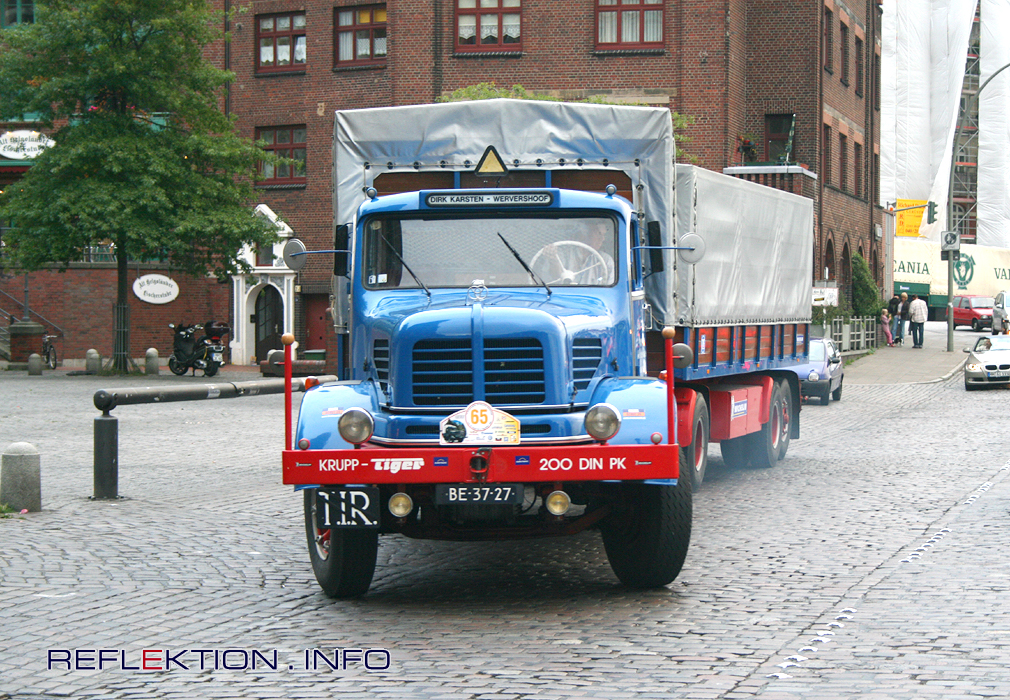 KRUPP TIGER Zum Abschluß der Deutschlandfahrt 2008 versammelten sich rund 70 historische LKW auf dem Hamburger Fischmarkt. Mit dabei war dieser KRUPP TIGER mit 3-Achs-Anhänger aus dem Jahre 1959