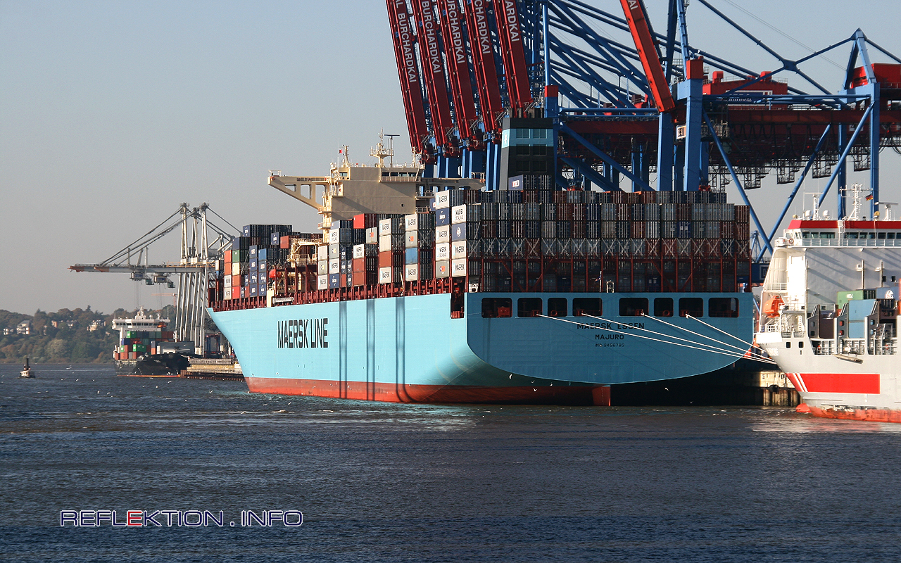 Containerfrachter MAERSK ESSEN Die erst im August in Dienst gestellte MAERSK ESSEN besucht auf ihrer Linie China-Hamburg-China (Fal5) zum ersten Mal Hamburg und hat für rund 24 Stunden am Containerterminal Burchardkai festgemacht. Die MAERSK ESSEN gehört zu den derzeit weltgrößten Schachteldampfern mit einem Fassungsvermögen von 13.092 20-Fuß-Containern (TEU). Das 366 Meter lange Schiff ist 48,20 Meter breit und liegt bis zu 15,50 Meter tief im Wasser. Der Hyundai-Wärtsilä-Motor leistet 68.640 kW (93.350 PS) und treibt das Schiff mit bis zu 24,3 Knoten -45 km/h- über die Meere. Bei den neuen Containerfrachtern dieser Größe überwiegt eine neue bauliche Konstruktion. So liegen die Aufbauten sehr weit vorn, die Maschinenanlage im Heck. Dies führt zu besseren Sichtverhältnissen nach vorn und damit höherer Beladung und einem besseren Massenausgleich im Schiffsrumpf.