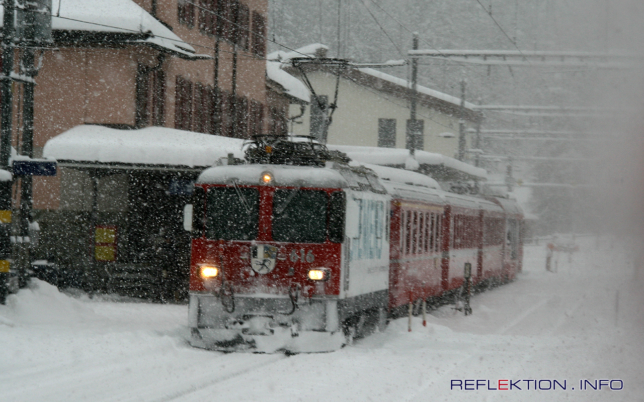RHÄTISCHE BAHN Engadin-Regionalexpress Bei heftigem Schneetreiben verläßt der Regional-Express nach Scuol/Tarasp über Samedan den Bahnhof von Pontresina. Zuglok ist die schon unglaubliche 40 Jahre alte Ge 4/4 II 616. Die rund 55 Kilometer lange Strecke vom Oberengadin ins Unterengadin liegt im ständigen Gefälle von auf 1774 Meter über Meer in Pontresina bis zur Endsation in Scuol/Tarasp rund 500 Meter tiefer auf 1286 Meter über Meer. Die Fahrtzeit beträgt rund 75 Minuten.