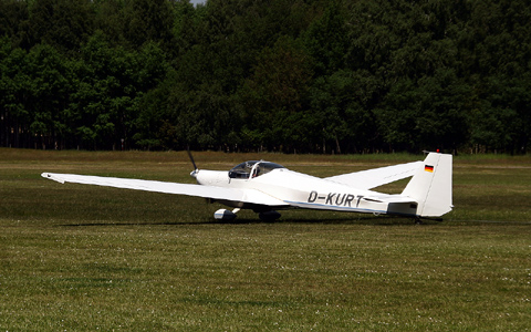 Motorsegler SCHEIBE SF 25 C D-KURT Die SF 25 ist vom Scheibe Flugzeugbau ab 1963 in verschiedenen Versionen gebaut worden und ist wahrscheinlich der weltweit am meisten gebaute Motorsegler. Die SF 25 C als Tiefdecker mit 2 Hauptfahrwerken und Spornrad wird noch heute gebaut. Meist sind die SF 25 C mit Motoren, die zwischen 80 und 115 PS leisten, ausgerüstet und besitzen somit ausreichend Leistungsreserven, als Schleppflugzeug für Segelflugzeuge eingesetzt zu werden. Die SF 25 C D-KURT des Hamburger Verein für Luftfahrt e.V. in Hamburg-Boberg ist starbereit für den nächsten Schleppflug - das hinter dem Sporn eingehängte Schleppseil ist gut sichtbar.