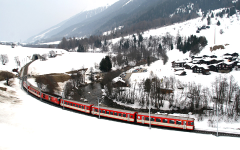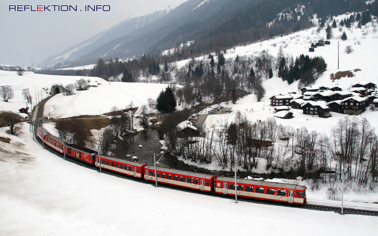 MGB Deh 4/4 53 REGIONALZUG In der Rhone-Schleife bei dem Dorf Blitzingen im schweizerischen Wallis ist der Regionalzug der MATTERHORN-GOTTHARD BAHN auf der Fahrt von Brig nach Oberwald. Als Zugmaschine dient der Zahnrad-Gepäcktriebwagen Deh 4/4 II 53 von 1979. Die Position des Zuges auf Google-Maps