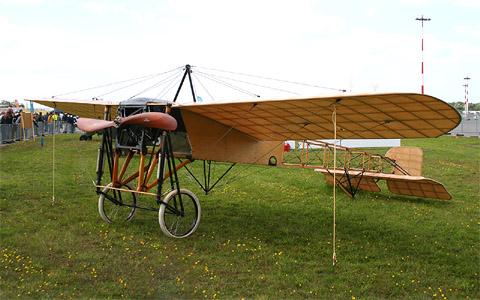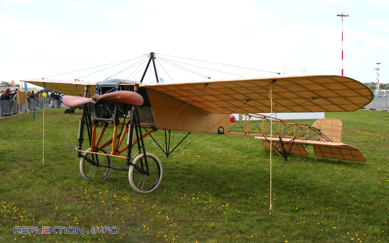 BLERIOT XI (THULIN A) Der französische Luftfahrtpionier Louis Bleriot gewann 1909 mit der erstmaligen Überquerung des Ärmelkanals mit einem Flugzeug den von der Londoner Zeitung Daily Mail ausgeschriebenen Preis von 1000 englischen Pfund Sterling (heute rund 120.000 Euro). Bleriot war in Calais gestartet. Bei einer Geschwindigkeit von rund 60 km/h in ungefähr 100 Meter Höhe landete er 37 Minuten später in Dover heil - nur das Fahrwerk seiner Maschine ging bei der Landung zu Bruch. Dieser Flug leitete eine für damalige Verhältnisse ungeheuerliche Nachfrage nach dem Muster BLERIOT XI ein. Bis 1915 verkaufte Bleriot rund 800 Maschinen des Typs XI. Die abgebildete Maschine ist ein Lizenzbau Thulin A von 1910 und auf vielen Flugtagen in ganz Europa zu bestaunen.