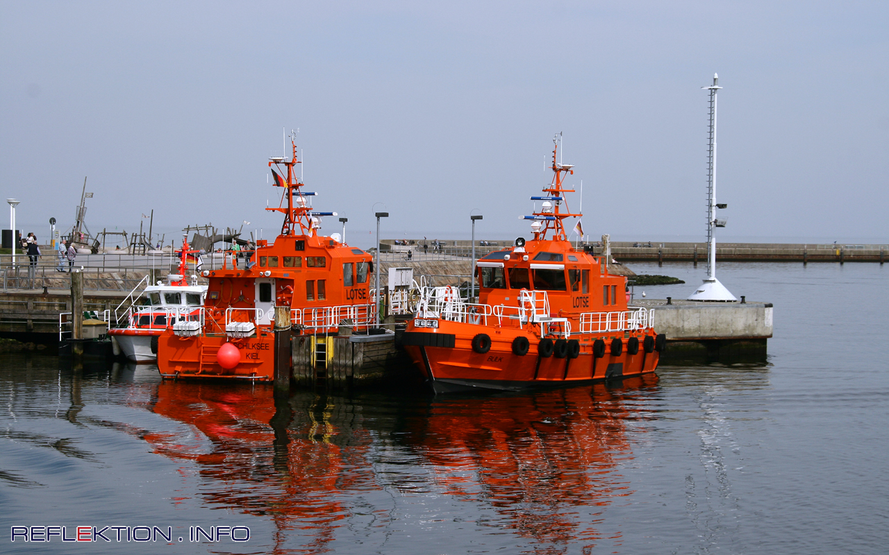 Alle Schiffe mit mehr als 60 Metern Länge und 10 Metern Breite müssen vom Lotsen übernommen werden. Für diesen Zweck hält Travemünde 2 Lotsenboote vor, links die SCHILKSEE (Heimathafen Kiel) und rechts die BÜLK.