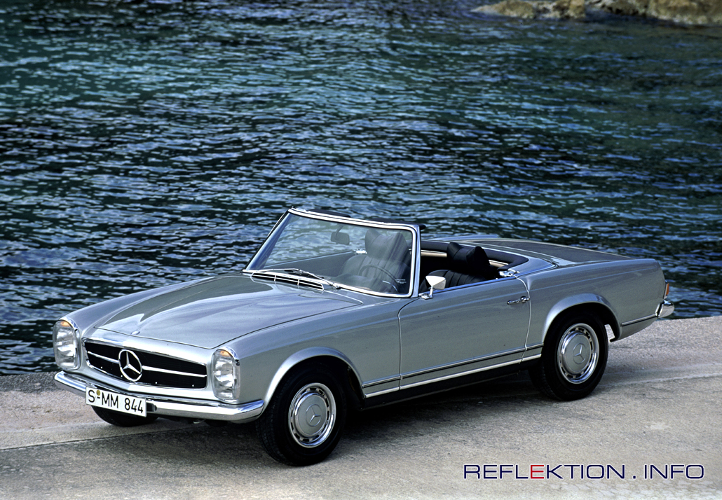 MERCEDES-BENZ 230 SL Als Nachfolger für die legendären 300 SL und 190 SL stellte MERCEDES 1963 den 230 SL vor. Er hatte von beiden etwas, aber er war nicht mehr der Sportwagen der Ehefrauen (190 SL) und er war auch nicht mehr der über alles Erhabene (300 SL). Die geraden Linien und der Aufbau mit großen Fenstern und zierlichen Streben ließen ihn etwas zurückhaltend und dezent erscheinen. So kam es, daß die 300 SL-Fans ihn niemals als Nachfolger akzeptieren konnten. Gegenüber dem 190 SL war die Leistung zwar deutlich größer, im Verhältnis zum 300 SL war der Neue aber ein Schwächling. Aus 6 Zylindern mit 2,3 Litern Hubraum kamen 150 PS, die nach langem Anlauf für 200 km/h gut waren. Fahrzeuge mit Automatikgetriebe errreichten 193 km/h. Das Hardtop paßte sehr gut zur Karrosserie und unterstrich die Eleganz des neuen SL. Aufsetzen und Abnehmen des Daches gelang mit 4 Händen recht zügig.