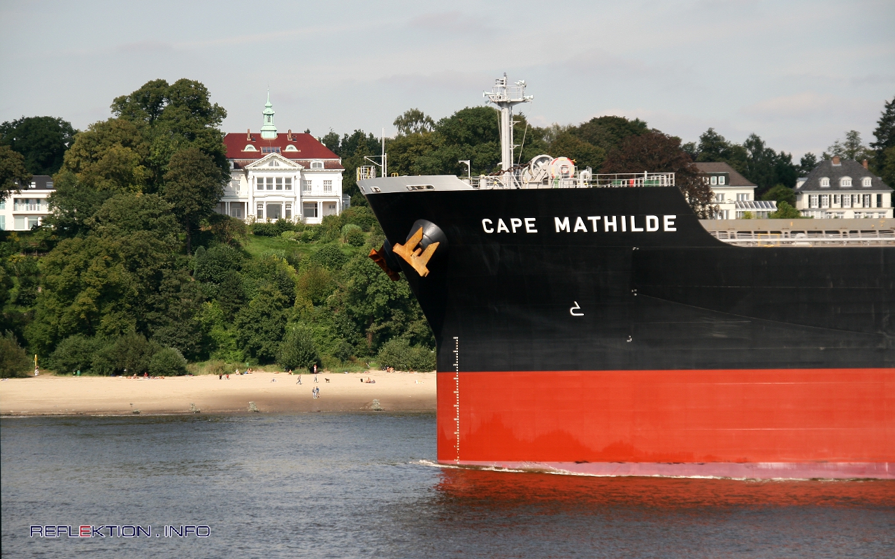 CAPE MATHILDE ist gerade ein Jahr alt und maximal 14 Knoten bzw. 26 km/h schnell. CAPE MATHILDE trägt bis zu 98.000 Tonnen Schüttgut und ist 292 Meter lang. Der Frachter ist 45 Meter breit und liegt voll beladen 18 Meter tief im Wasser. Bei dieser Leerfahrt sind rund 10 Meter Tiefgang gut an der Lademarke abzulesen.
