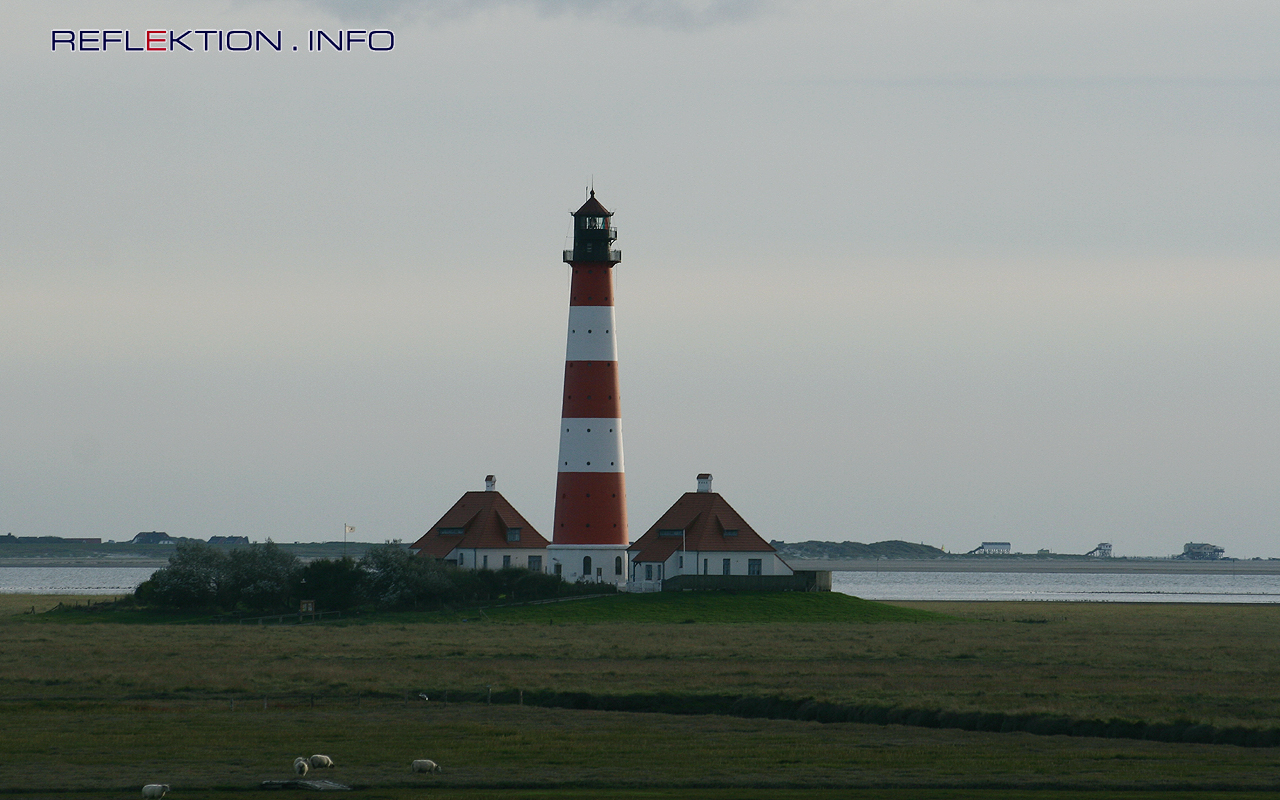 Leuchtturm WESTERHEVERSAND Der Leuchtturm wurde von 1906 bis 1908 errichtet. Das Leuchtfeuer weist den Weg durch den Heverstrom, den durch ständig wechselnde Sande schwierigen Schiffahrtsweg nach Husum. Das 41 Meter hohe Leuchtfeuer leuchtet 21 Seemeilen (39 km) weit - bei klarer Sicht ist es sogar noch vom 55 Kilometer entfernten Helgoland auszumachen. Seit 1979 wird der Leuchtturm vom Wasser- und Schiffahrtsamt in Tönning ferngesteuert, so daß die beiden neben dem Turm stehenden Wohnhäuser nicht mehr von den Leuchtfeuerwärter-Familien bewohnt werden. Heute nutzt die Schutzstation Wattenmeer die beiden Gebäude. Der wohl bekannteste Leuchtturm in Nordfriesland wird seit vier Jahrzehnten als Werbemotiv vom ostfriesischem Jever-Bier genutzt: wie das Land, so das Jever - aber eben doch nicht! Jenseits der Bucht im Hintergrund sind die markanten Stelzenbauten am Strand von St. Peter-Ording zu sehen.
