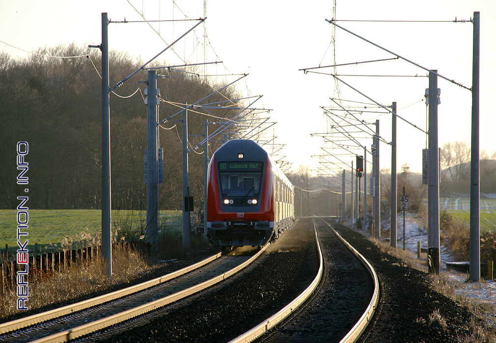REGIONALBAHN SCHLESWIG-HOLSTEIN Mit Beginn des Winterfahrplans am 14. Dezember 2008 begann nach mehrjähriger Bauzeit das Zeitalter des elektrischen Zugbetriebs auch auf der stark befahrenen Hauptstrecke Hamburg - Lübeck. Eingesetzt werden bei der Regionalbahn SH nun hauptsächlich Eloks der Baureihe 112. Neben modernen Doppelstockwagen (DB-Sprache: Dosto) - hier als Regionalexpress - finden sich zum großen Teil auch Personenwagen, die die besten Tage bereits seit langer Zeit hinter sich haben. Die tiefstehende Sonne und die klare, sehr kalte Luft schaffen die ungewöhnlichen Lichtverhältnisse gut eine Stunde vor Sonnenuntergang.