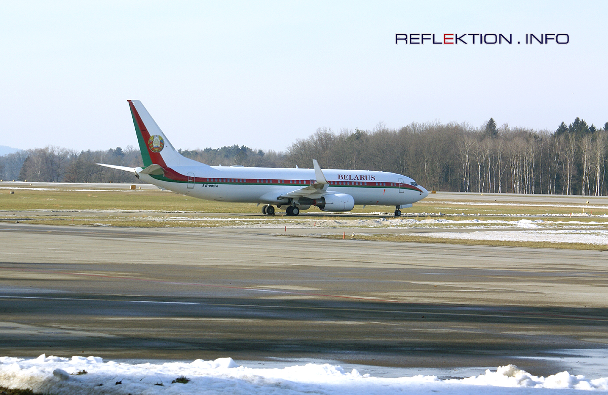 BOEING 737-8EV (BBJ2) EW-001PA Zum Weltwirtschaftsforum nach Davos waren die Delegierten Weißrußlands mit der Regierungsmaschine vom Typ BOEING 737-800 (Baujahr 2002) in der Ausführung als BOEING-BUSINESS-JET (BBJ) gekommen. Auch nach einige Tage nach Beendigung des Forums stand die Maschine noch in Kloten - vielleicht hat man einige Tage Skiurlaub angehängt?