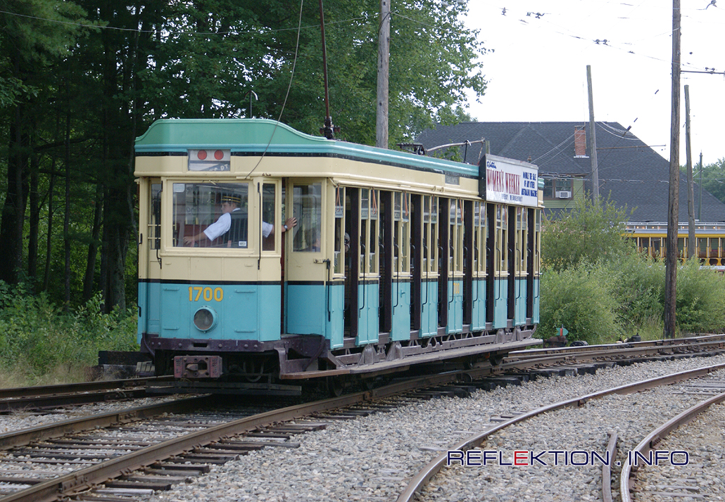 SEASHORE TROLLEY MUSEUM in Kennebunkport, Maine, USA. Das Museum zeigt eine große Anzahl von Straßenbahnen, die aus allen Teilen der Welt kommen. Der Wagen 1700 stammt von den SYDNEY TRAMWAYS, die ihn bis 1960 einsetzten. 1926 ist der Wagen für die New South Wales Government Tramways von der Meadowbank Manufacturing Company gebaut worden. Sehr ungewöhnlich für eine Straßenbahn ist die Einteilung des Wagenkastens in 8 Abteile ohne duchgehenden Seiten- oder Mittelgang. Durchgehende Seitenlaufbretter ermöglichen den Zugang zu den Abteilen.