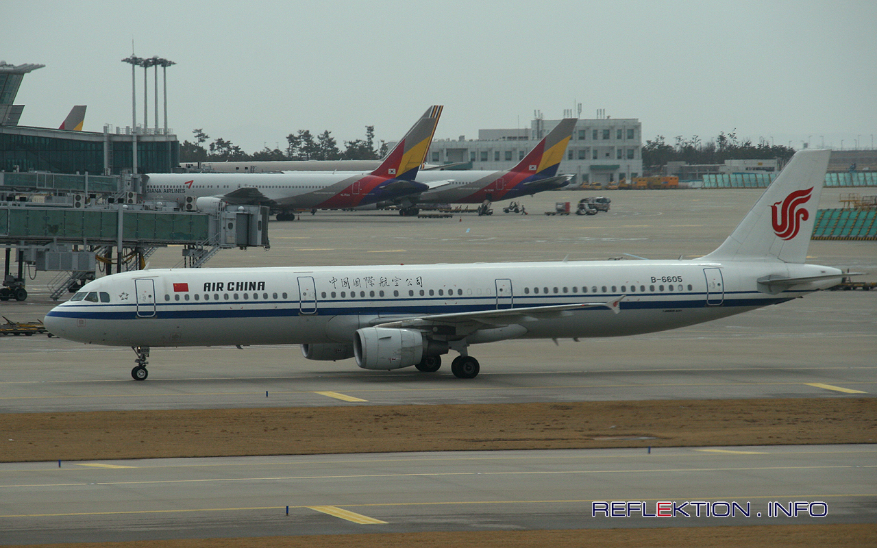 AIR CHINA AIRBUS A321-200 B-6605 AIR CHINA ist mit 276 Flugzeugen die zweitgrößte chinesische Fluggesellschaft. AIRBUS ist mit allen Typen und insgesamt 107 Flugzeugen, davon 78 aus der 320-Familie, vertreten. Das Durchschnittsalter der Maschinen ist mit rund 7 1/2 Jahren recht jung. Vom Drehkreuz Peking fliegt AIR CHINA Ziele in allen Kontinenten an. In Deutschland fliegt AIR CHINA als Mitglied der STAR ALLIANCE nach Frankfurt, Düsseldorf und München. Die etwas altbackene Lackierung chinesischer Verkehrsflugzeuge läßt die Maschinen deutlich älter erscheinen. So ist diese A321-200 B-6605 fabrikneu erst am 11. November 2009 in Hamburg-Finkenwerder an AIR CHINA übergeben worden. Siehe dazu auch das Bild des Tages vom 28.3.2011 Die 3 BOEING 777 mit dem farbenfrohen Leitwerk im Hintergrund gehören der südkoreanischen Fluggesellschaft ASIANA AIRLINES.
