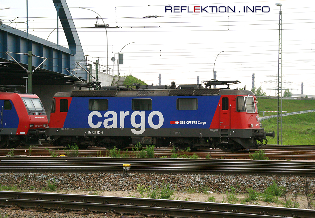 SCHWEIZERISCHE BUNDSBAHN SBB CARGO Re 421 Die Lok wird zur Zeit im Containerverkehr der Hamburger Containerterminals eingesetzt. Für den Betrieb in Deutschland ist die Lok mit einem breiteren Stromabnehmer und einer Indusi (induktive Zugsicherung) ausgerüstet. Während der Ruhezeiten stehen Lokomotiven aus halb Europa unter der Brücke am Finkenwerder Knoten. Technische Daten SBB CARGO 421 397-0 ex Re 4/4 II 11393 Spurweite 1435 mm Stromsystem 15000 V, 16.7 Hz ~ Leistung 4700 kW (6320 PS) Stundenzugkraft 167 kN Anfahrzugkraft 255 kN Höchstgeschwindigkeit 120 km/h in Deutschland, sonst 140 km/h Achsfolge Bo' Bo' Gewicht 85 t Länge über Puffer 15.52 m Inbetriebssetzung 1985, umgebaut für SBB Cargo Deutschland 2004