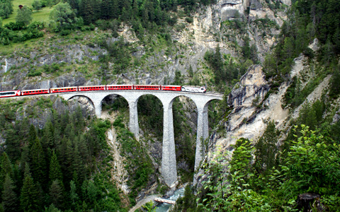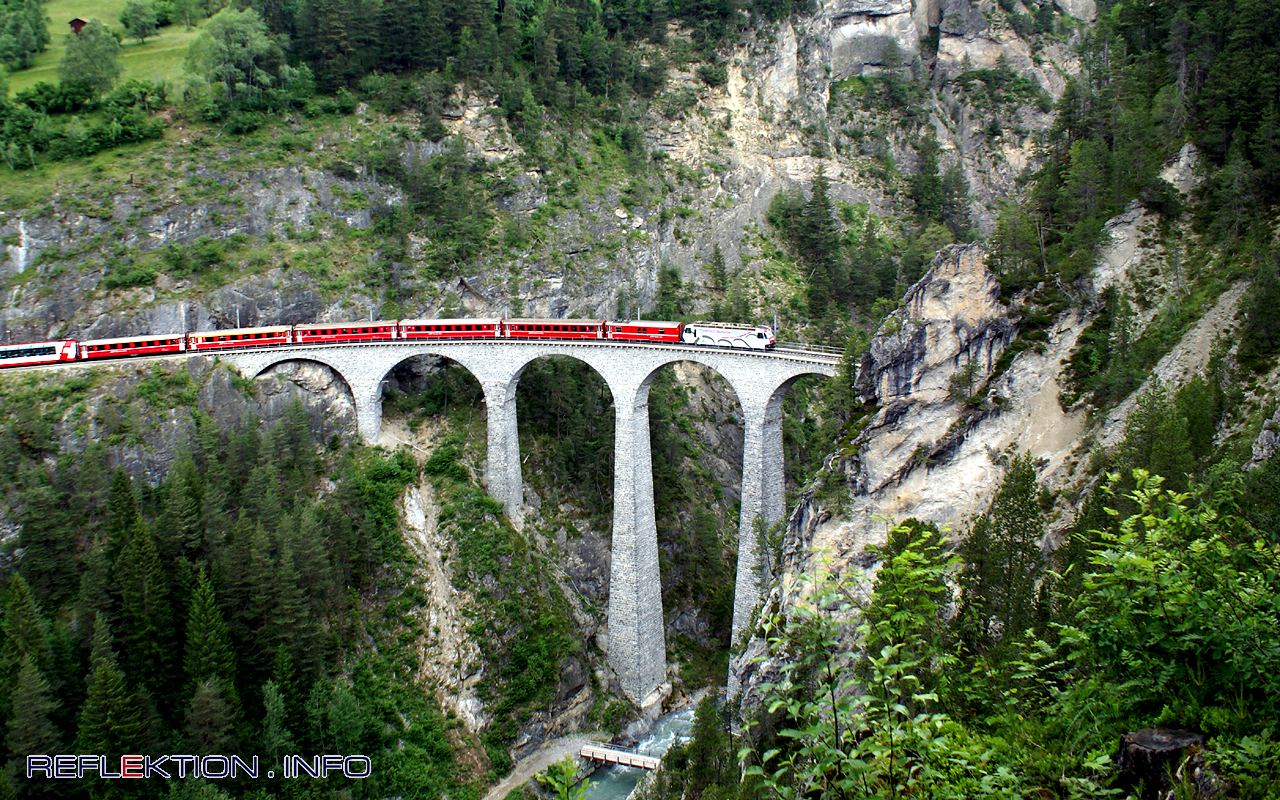 RHÄTISCHE BAHN - GLACIER EXPRESS Auf seiner Fahrt von Zermatt nach St. Moritz hat der GLACIER EXPRESS soeben den Landwasser-Viadukt als das bekannteste Bauwerk der RHÄTISCHEN BAHN erreicht. Der Viadukt mündet an der senkrechten Felswand direkt in den Landwasser-Tunnel. 2 Minuten Fahrzeit sind es dann noch bis zur Kreuzungsstation Filisur.
