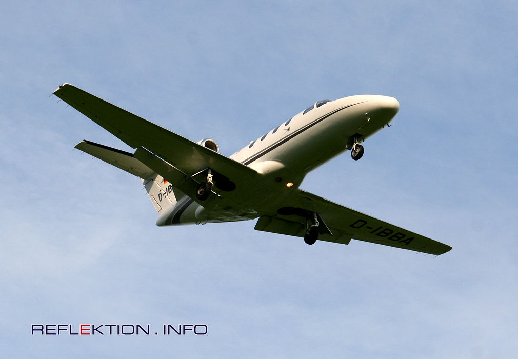 CESSNA 525 CITATION CJ1 D-IBBA ist ein zweistrahliges Reiseflugzeug bzw. Businessjet und wird seit 1998 in dieser Ausführung gebaut. Einige Daten: 1-2 Piloten und max. 5 Passagiere Länge 12,98 m, Spannweite 14,32 m, Höhe 4,19 m Kabine LxBxH 3,35 m x 1,47 m x 1,45 m Leergewicht 3.070 kg, max. Startgewicht 4.850 kg , max. Landegewicht 4.490 kg max. Nutzlast 725 kg max. Geschwindigkeit 790 km/h, wirtschaftl. Reisegeschwindigkeit 700 km/h Dienstgipfelhöhe 12.500 m, max. Reichweite 2.400 km Startstrecke 990 m, Landestrecke 795 2 Triebwerke Williams FJ 44-1A mit max. 2 x 8,45 kN Schub Preis ab 4,8 Mio US $