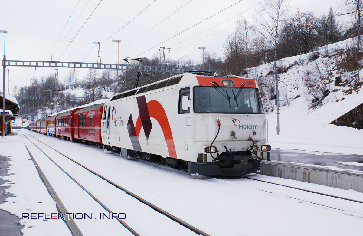 STAZIUN FILISUR - RHÄTISCHE BAHN Filisur, unter Eingeweihten auch “Olten der RhB” genannt, ist eine wichtige Station der Rhätischen Bahn an der Albula-Bahn (ähnlich dem Bahnhof Olten bei den Schweizerischen Bundesbahnen). Hier zweigt von der Linie St. Moritz - Chur die Linie nach Davos ab. Der Schnellzug aus Chur mit der Zuglok Ge 4/4 III 649 wartet die Einfahrt des Gegenzuges aus St. Moritz ab. Vom Schnellzug verdeckt wartet auf dem nächsten Gleis der Zug nach Davos auf die Fahrgäste aus St. Moritz nach Davos. Am Ende der Station im Bild ganz links hinten führt das rechte Gleis in einer Rechtskurve über das berühmte Wiesener Viadukt nach Davos. Das linke Gleis geht ebenfalls in einer allerdings größeren Rechtskurve durch einen kurzen Tunnel und über das noch berühmtere Landwasser-Viadukt nach Thusis und Chur. Im Rücken des Fotografen führt die Strecke eingleisig durch das berühmte Albula-Karussell nach St. Moritz.