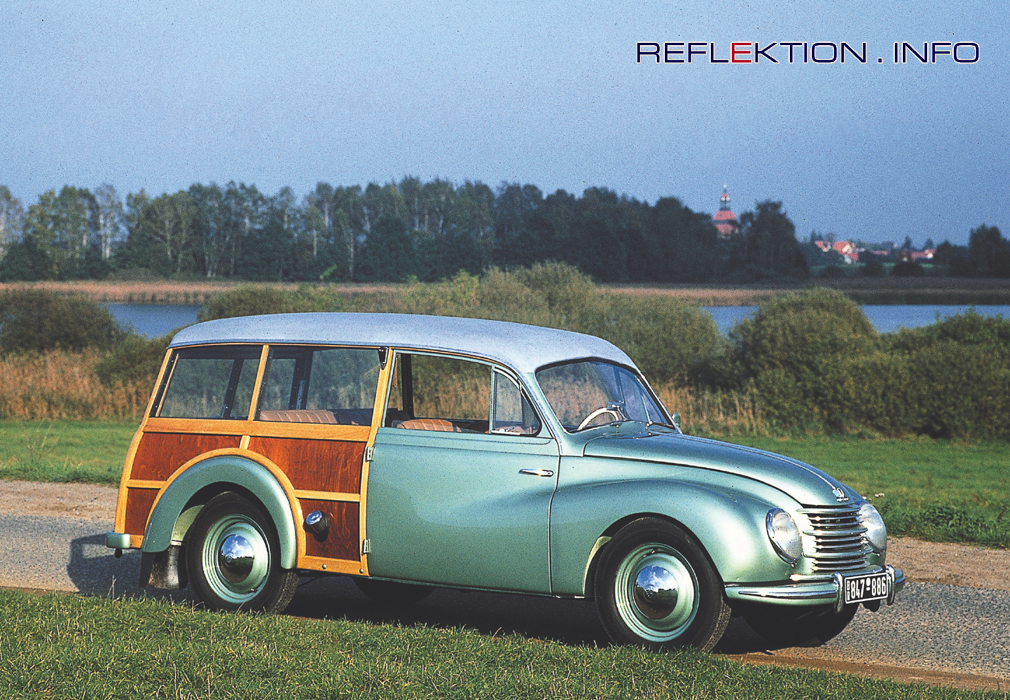 DKW Meisterklasse Universal F 89 S Von 1950 bis 1954 bot DKW den dreitürigen Kombi mit Holzverschalung des Hecks an. Einige Daten: Länge 4200 mm, Breite 1600 mm, Höhe 1450 mm Leergewicht 800 kg 2 Zylinder, 2 Takte, Hubraum 690 cm³, Frontantrieb Verdichtung 6.30:1 Leistung 23.3 PS Tankinhalt 32 Liter Höchstgeschwindigkeit 100 km/h Preis 1953 rund 6000 DM (ungefähr 30 Monatsgehälter eines kfm. Angestellten)