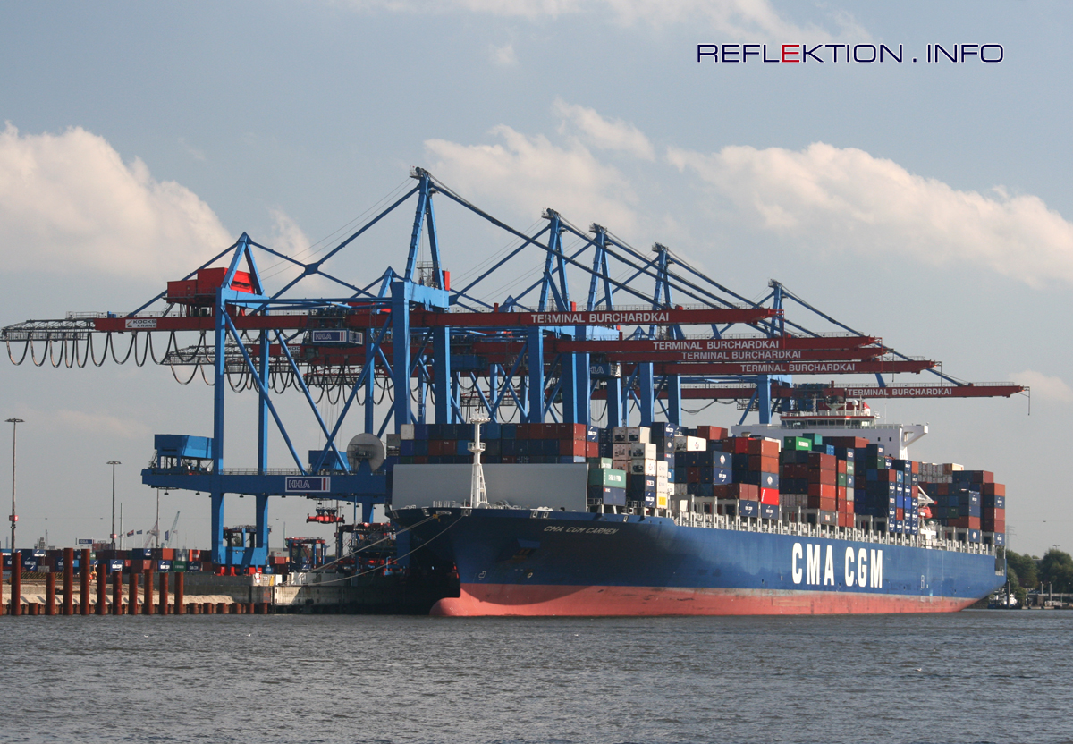 Containerfrachter CMA CGM CARMEN Die CARMEN der Reederei CMA CGM liegt in Hamburg-Waltershof am Container Terminal Burchardkai. Das Schiff verkehrt im Linienverkehr nach Asien und erreicht Hamburg rund viermal jährlich. Die Reederei CMA CGM ist die drittgrößte Containerschiff-Reederei der Welt. 5 Schiffe der in Marseille ansässigen CMA CGM kommen wöchentlich im festen Fahrplan nach Hamburg. Die CARMEN wurde 2001 bei Hanjin Ind. gebaut. IMO-Nr. 9235907 Länge: 300,25 m, Breite: 40,30 m, Tiefgang: 14,5 m Kapazität: 6627 TEU (20-Fuß-Container) Tonnage: 73.157 BRT Maschine: M&W Hundai 12K-98MC-C, Leistung: 68.536 KW, 1 Propeller Geschwindigkeit max. 26,5 Knoten (49 km/h)