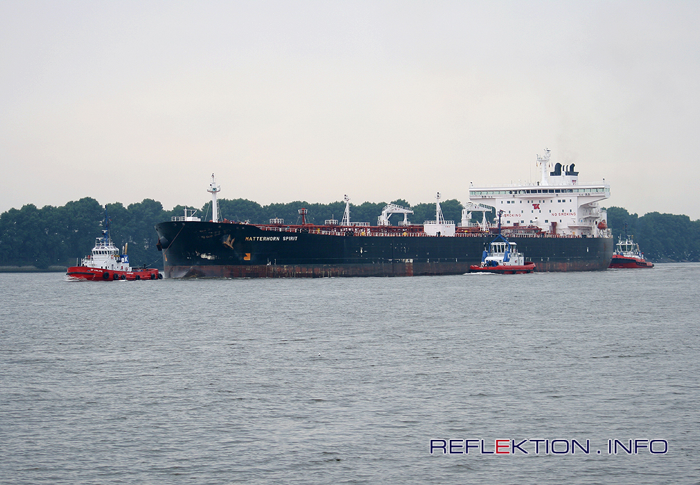 MATTERHORN SPIRIT Der die Elbe herauf kommende Tanker MATTERHORN SPIRIT wird bei der Lotsenstation am Hafenanfang von den drei Hafenschleppern ZP CHALONE, TUMAK und RT ZÖE der Reederei KOTUG empfangen und zum Liegeplatz im Hansahafen bugsiert. Daten der MATTERHORN SPIRIT: Schiffstyp: Doppelhüllentanker Eigner: MATTERHORN SPIRIT LLC Reederei: TEEKAY SHIPPING CANADA, Vancouver Heimathafen: Nassau, Bahamas Länge: 253 Meter, Breite 44 Meter, max. Tiefgang 14,82 Meter Bauwerft: Daewoo Shipbuilding & Marine Engineering Co. Ltd., Bau-Nr. 5255 Indienststellung: 7. November 2005 Fassungsvermögen Öl-Fracht 800.341 Barrel á 154 Liter Hauptmaschine: MAN B&W, Maschinenleistung an der Welle 28.800 PS Maschinenbetriebsstoff: 20.451 Barrel Höchstgeschwindigkeit 18 Knoten (34 km/h)