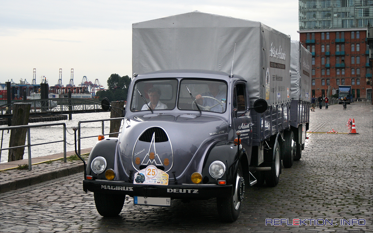 MAGIRUS DEUTZ SIRIUS, Bj. 1964 Vor 51 Jahren gründete Artur Adams in Niederzissen in Rheinland-Pfalz die Spedition Adams. Nach drei Jahren wurde der Fuhrpark auf vier Fahrzeuge erweitert. Einer der Zugänge war dieser MAGIRUS DEUTZ SIRIUS. Knapp 30 Jahre später wurde der SIRIUS in der speditionseigenen Werkstatt von Grund auf restauriert. Dabei wurde auf der Pritsche unter der Plane ein Wohnmobil installiert. Seit 1994 nehmen Resi und Artur Adams mit ihrem SIRIUS an diversen Oldtimertreffen und Wettbewerben teil. Bei diesen Fahrten wurden mehrere Preise gewonnen, zuletzt der 1. Platz für die erfolgreiche Teilnahme an der Historischen Deutschlandfahrt. Diese führte von Berlin über Dresden, Prag, Bratislava, Wien, Passau und München nach Hannover zur IAA Nutzfahrzeuge.